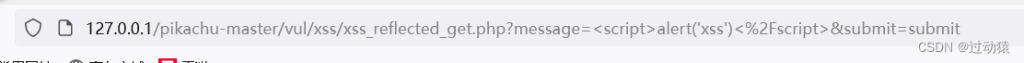 6、且观察网页url,发现写的js代码也出现在url里面,可以判断出这是GET方式的XSS漏洞。因此进行攻击时,可以直接在url中写入恶意代码进行攻击。